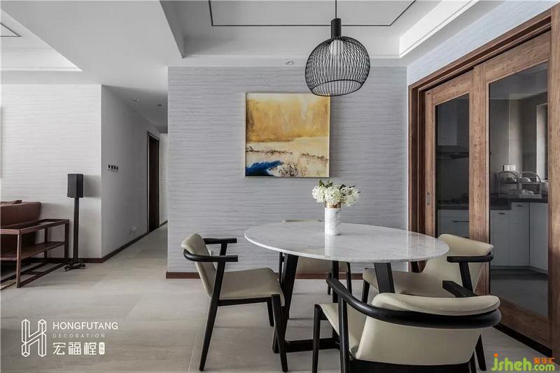 餐廳選用客廳同款吊頂,與走廊空間平頂不同,自然分割功能區(qū)。