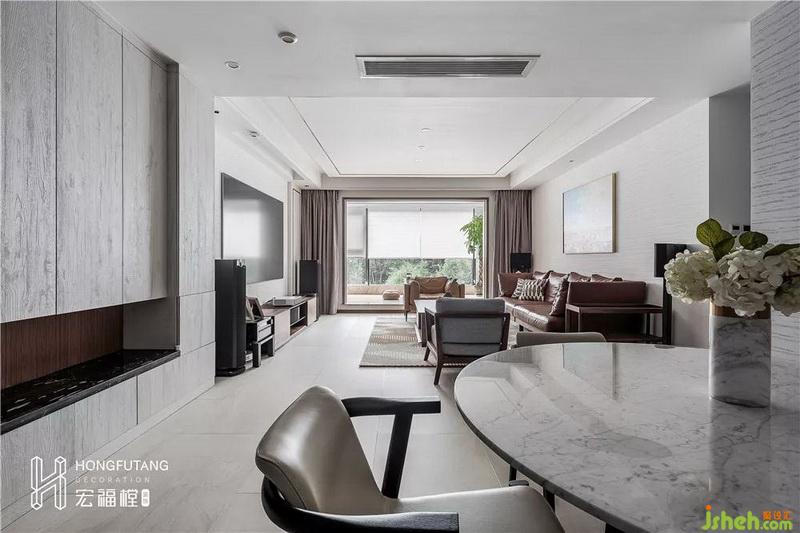 考慮到家中常駐人數,選用四人圓桌,不占用太多空間同時,大理石材質和顏色更符合整個空間風格;餐廳墻面選用灰色條紋,為增添餐廳活力,選用暖色系掛畫改善冷淡的用餐空間。