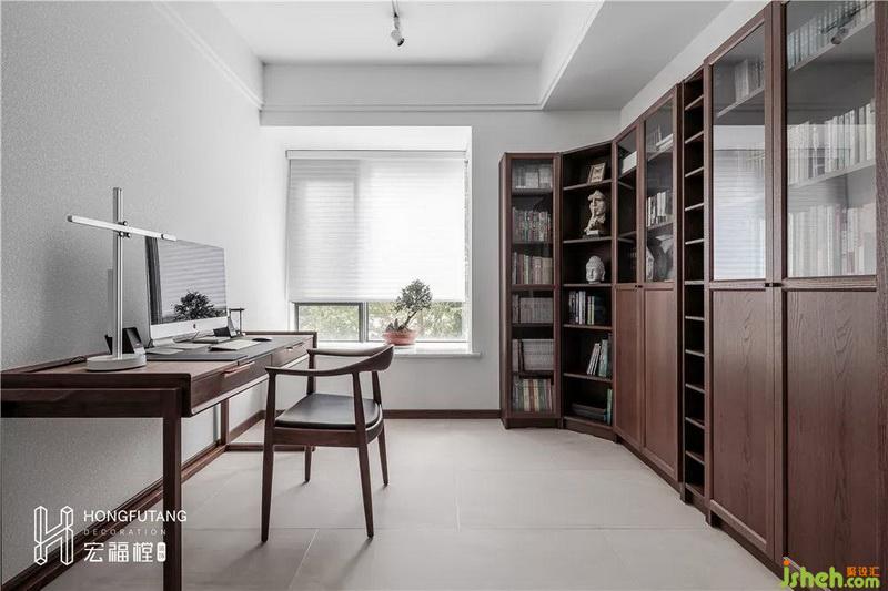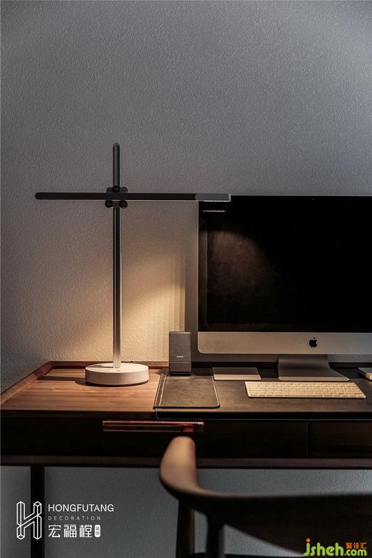 業(yè)主藏書量大,右側選用上透明下封閉的書柜,剛好容納業(yè)主的書籍;左側設立書桌,選用胡桃木顏色配合客廳空間風格,臺燈的選用是業(yè)主喜好的新奇電子產品類型;百葉簾在書房使用能夠合理的控制書房光線。