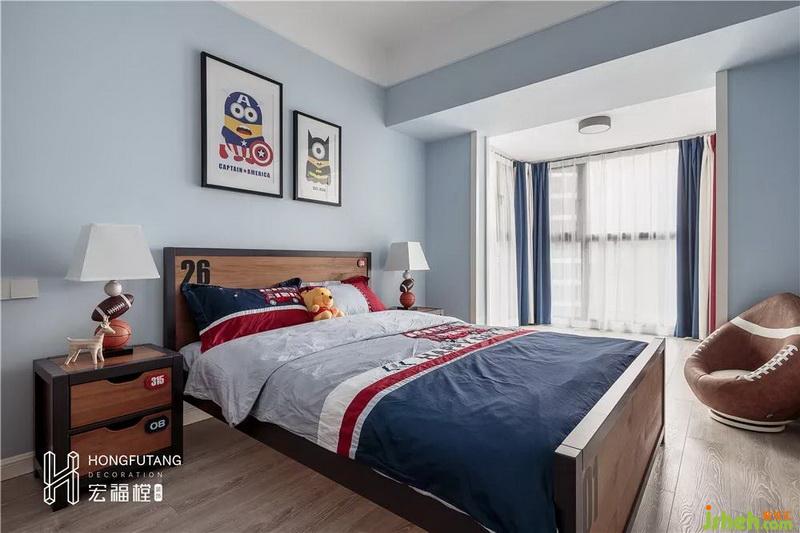 原始兒童房空間較小,所以選用擺放斗柜,可以收納小朋友玩具;衣柜設(shè)立在原有陽臺(tái)右側(cè),用衣柜分隔陽臺(tái),既增加了收納空間,又達(dá)到相互獨(dú)立的效果;陽臺(tái)左側(cè)擺放書桌,可以用于小朋友學(xué)習(xí)閱讀區(qū),考慮到是小朋友是弟弟,兒童房元素主要以男孩運(yùn)動(dòng)為主。