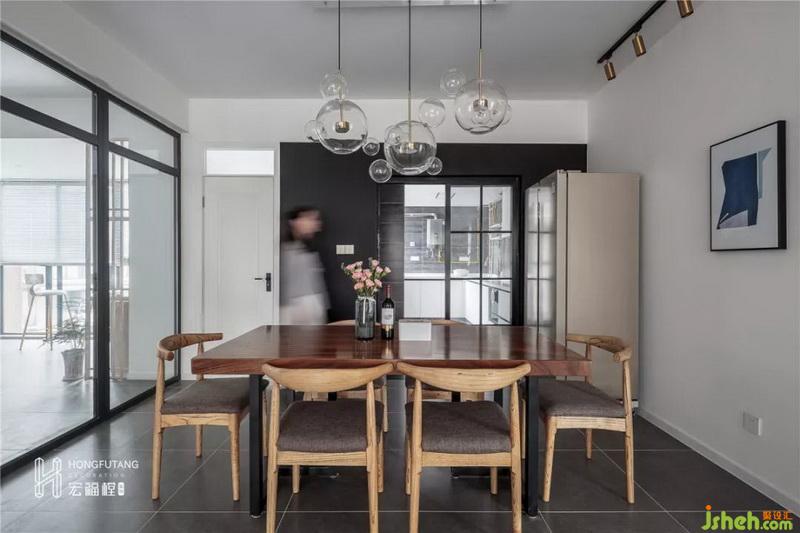 餐廳左側(cè)墻體拆除,選用玻璃隔斷將其與書房隔開,玻璃隔斷的采用使得餐廳采光更好,空間更加通透,右側(cè)采用軌道燈平衡餐廳燈光;座椅選用原木軟座使得用餐體驗感更加舒適;依靠廚房的墻面色彩選用黑色,是日式風(fēng)格向北歐風(fēng)格的過度,也將整個空間的重心突出,避免了大白墻的空白。