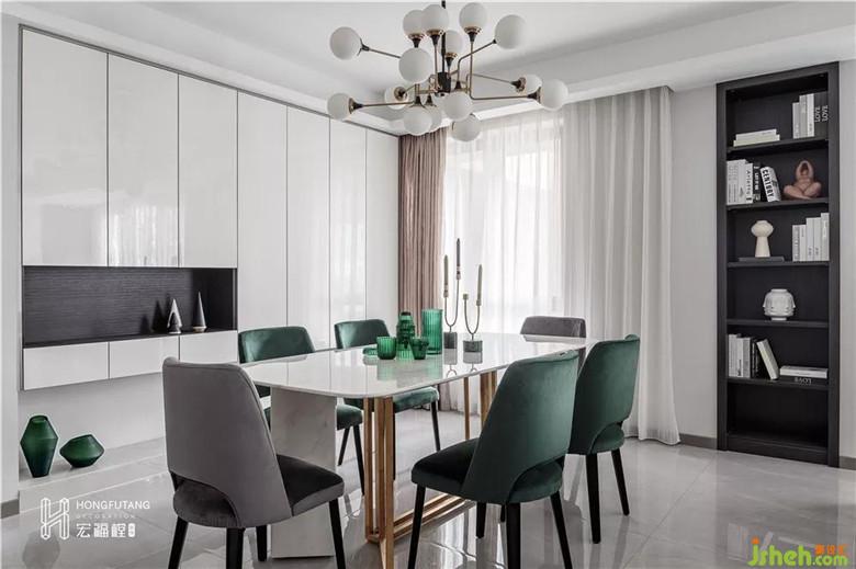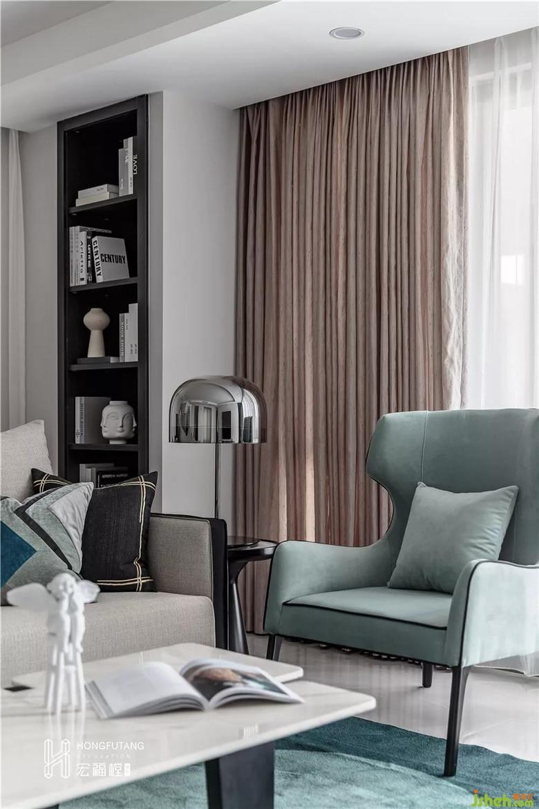 客廳選用簡單的黑白為主色,白色大面積出現(xiàn),黑色作為線條輔助,在視覺上給人一種純粹感,空間整體沉穩(wěn)內(nèi)斂;再以薄荷綠、墨綠作為軟裝搭配,賦有干凈利落的質(zhì)感,又不失生命的活力。沒有選用過多的裝飾,以少勝多,以簡勝繁就是對整個空間最好的詮釋。