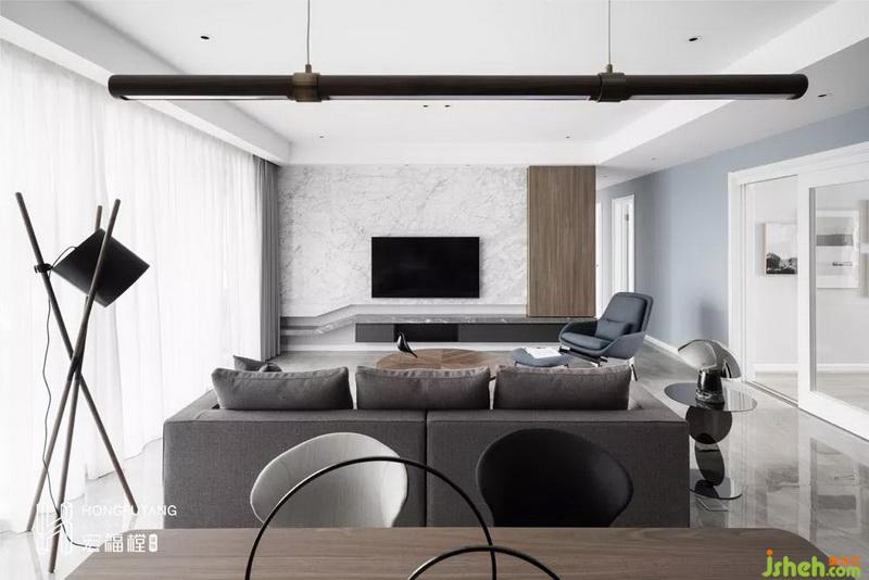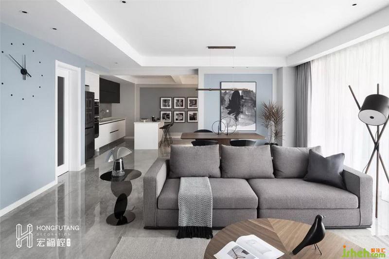 室內(nèi)設(shè)計師在客廳選用月光藍搭配白色使用,安靜祥和,除了墻壁掛鐘設(shè)計,沒有多余的擺設(shè),從一個方面反映了業(yè)主的職業(yè)特點,知性冷靜。將客廳想象成數(shù)學課程,不多不少,每一個物件都有在此出現(xiàn)的實際意義。