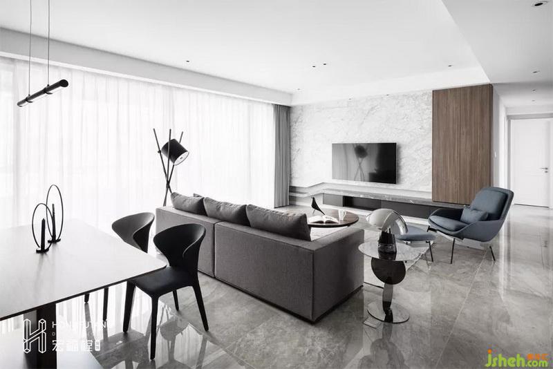 客廳與餐廳位于同一個空間內(nèi),依靠沙發(fā)背景自然分界,相互獨立,互不干擾。