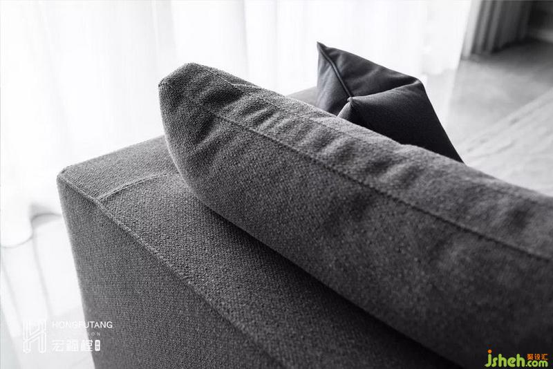 選用豆沙灰布藝沙發(fā),色彩搭配上與整個空間氣質(zhì)相符,從材質(zhì)上,肉眼可見的粗顆粒更有質(zhì)感。難得出現(xiàn)的暗色調(diào),強調(diào)空間視覺重心。