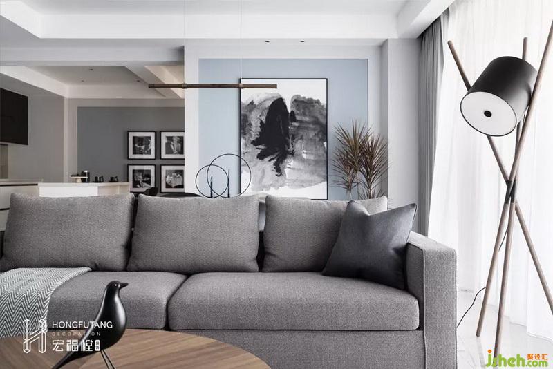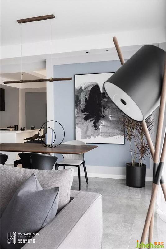 在沙發(fā)處搭配木質(zhì)落地燈,補足了客廳休閑閱讀燈光和觀影的氛圍,兼做擺件出現(xiàn),與另一側(cè)邊幾呈對稱布局。