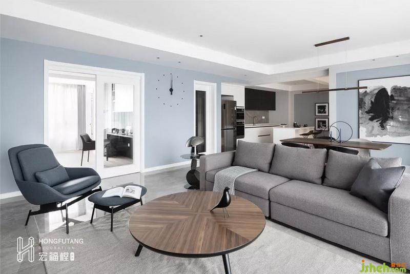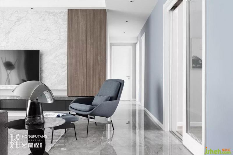 圓形茶幾不會占用太多的空間,木質(zhì)材質(zhì)的使用使得低明度冷色系的空間有了溫度,搭配地毯,帶來歸家的溫馨感??蛷d設(shè)立的躺椅也能滿足業(yè)主日常閱讀所需。