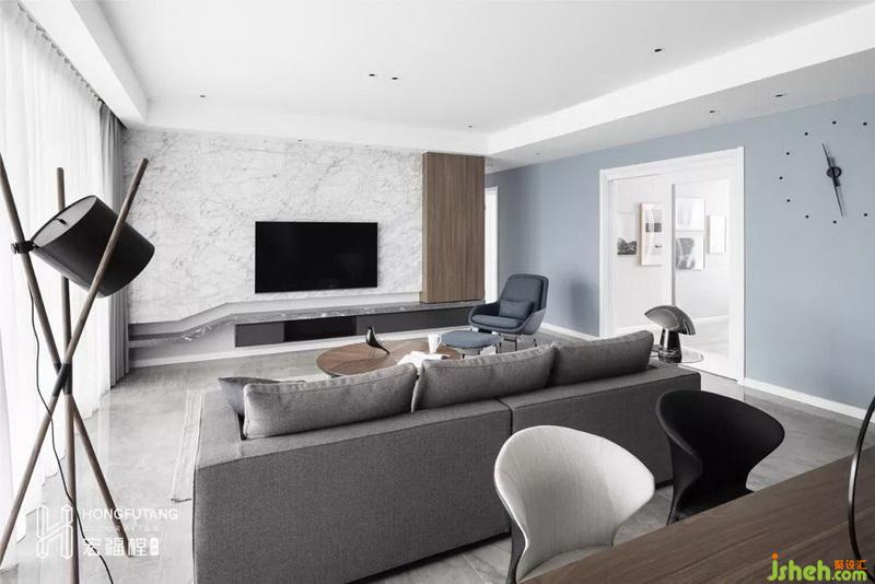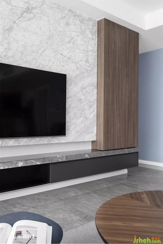選用木質(zhì)包邊設(shè)計,電視墻質(zhì)感多元化,大理石和木質(zhì)搭配,利用自然紋理,空間線條感更強。