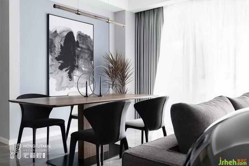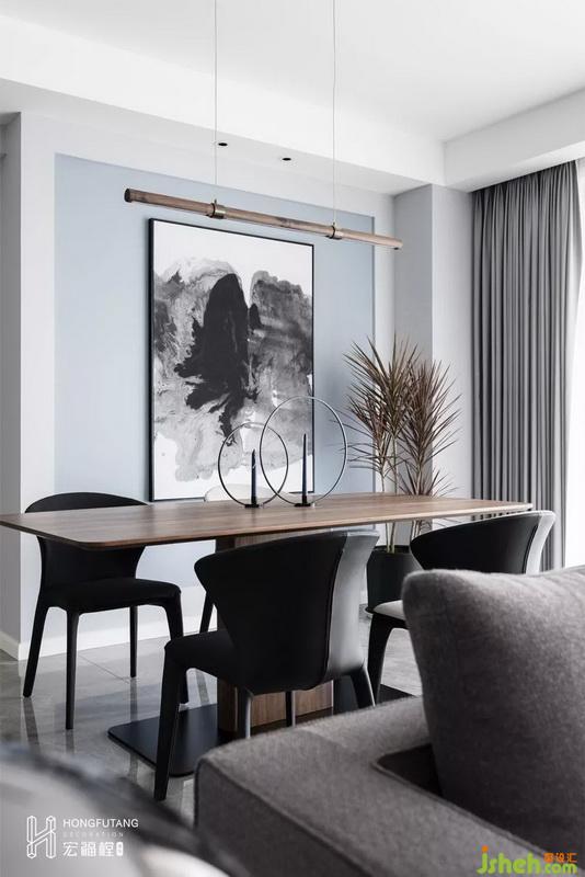 餐廳是團圓熱鬧的代表,選用木質(zhì)餐桌將空間氛圍烘托到最高點,與客廳元素相呼應(yīng)。木質(zhì)橫向吊燈,滿足了照射范圍,簡潔清爽;以水墨畫豐富餐廳空間。以簡單的物件呈現(xiàn)餐廳的合理搭配。