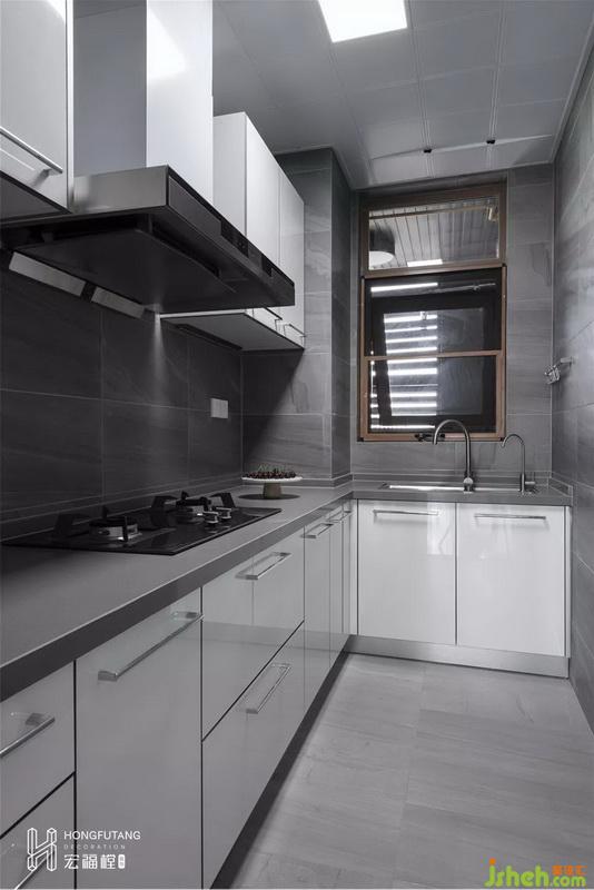 原始廚房空間有限,作為中廚使用,灰色波紋瓷磚的使用,增添空間紋理感,冷色調(diào)的運(yùn)用綜合了廚房的燥熱感,從實(shí)用性方面來說,更耐臟。
