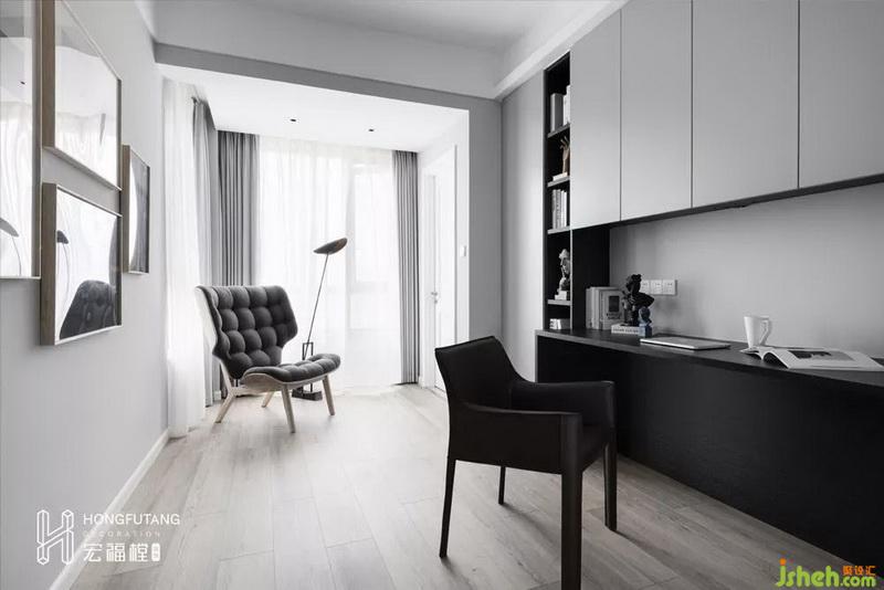 書房閱讀區(qū)域由原始陽臺擴(kuò)大而來,增設(shè)書房的視野,改善書房采光條件。在躺椅上選用舒適的閱讀姿勢,疲憊時(shí)眺望遠(yuǎn)方,即使忙碌工作也不能忽略眼前的風(fēng)景。