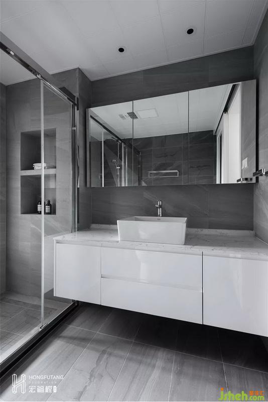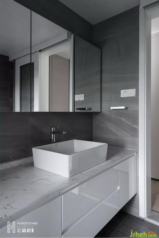 衛(wèi)生間打破常規(guī)鋪貼方式,選用幾何形鋪貼方式,營造空間立體幾何感,區(qū)域劃分清晰,符合數(shù)學(xué)老師幾何思維。