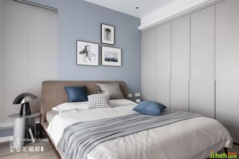 室內(nèi)設(shè)計(jì)師在主臥延續(xù)客廳色彩,月光藍(lán)帶來的沉靜感,使得主臥空間更加純凈、放松。