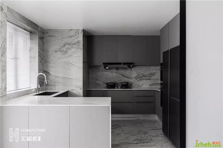 步入餐廳的空間,開放式L型廚房,家庭的生活重點。從情感上來說,此時的廚房不僅是單純作為烹飪空間使用,更是一家提高交流和共情的最佳場所。從物理使用來看,開放式的廚房更能滿足更多功能的使用,提高空間使用率,提高生活品質(zhì)。