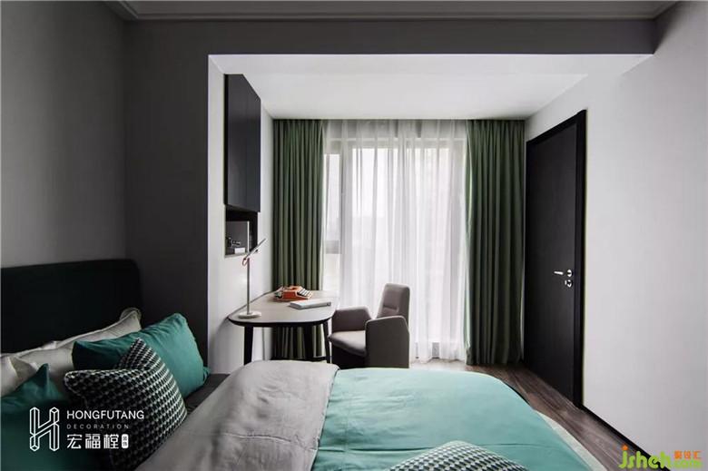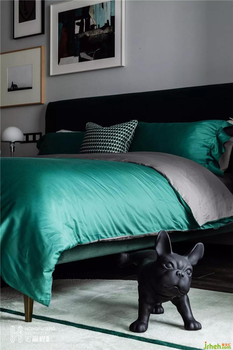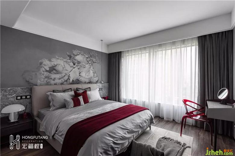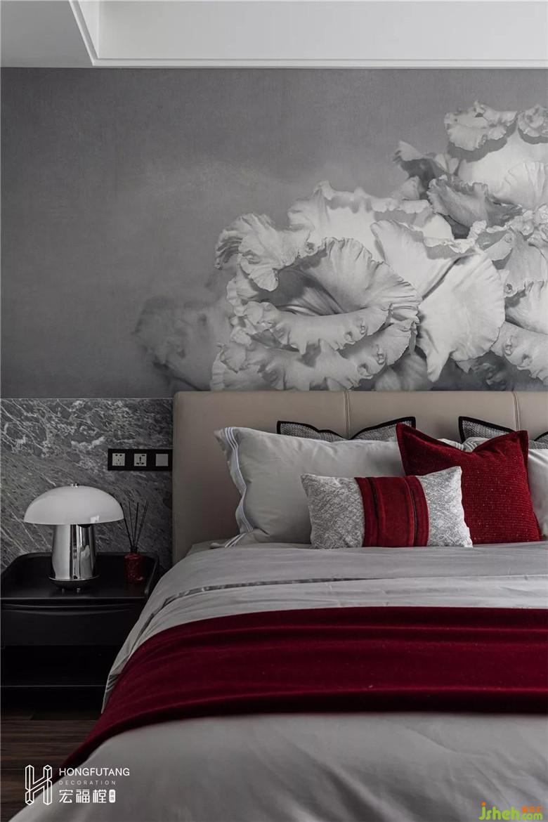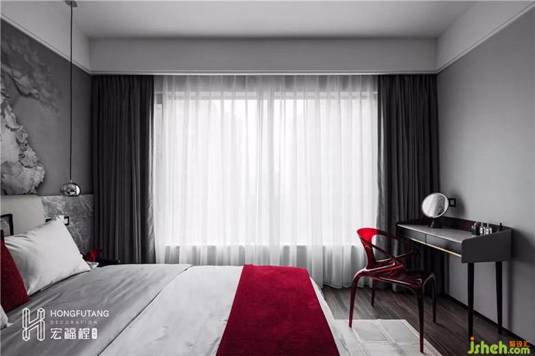 空間設計中,色彩是至關(guān)重要的因素,能起到傳遞情感和視覺提示的作用。伊夫圣羅蘭曾經(jīng)說過:“紅色是令人驚奇的!”,紅色系色彩充滿生命力,滿足了我們對于樂觀生活和愉悅身心的訴求,為忙碌的生活注入一絲絲活力。主臥延續(xù)灰色調(diào),以黑白灰來區(qū)分空間的重心,龐貝紅作為填充色。搶眼的龐貝紅成為主臥空間的點睛色,不需要占比過多,兩者交融出的色彩張力讓人難以抗拒,優(yōu)雅而時尚,尊貴而霸氣。