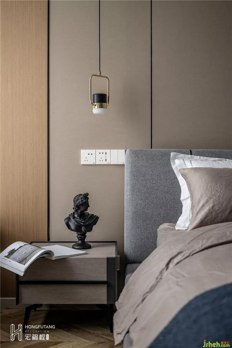 裝修公司選用床頭吊燈搭配點(diǎn)位燈,滿足日常使用燈光,無主燈設(shè)計使得空間更加純粹干凈。