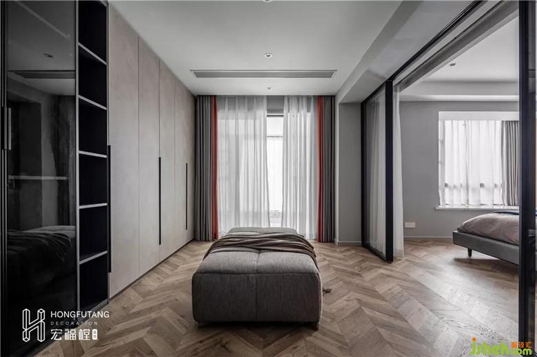 裝修公司利用極窄邊的玻璃推拉門進(jìn)行空間分割,鏡面交錯的光影,讓空間更顯通透敞亮,臥室與衣帽間有了更加緊密的聯(lián)系,增加了互動性;原木色魚骨拼地板鋪滿主臥和衣帽間,魚骨拼裝傾斜的線條對整體空間都有一定的延伸效果,整體視覺更加廣闊。魚骨地板的選用凸顯強(qiáng)烈的藝術(shù)立體感,魚骨拼接具有超“顏值”的同時,也讓空間充滿優(yōu)雅精致的魅力。