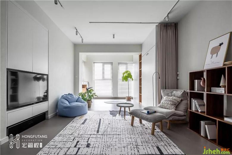整體設(shè)計以白色為主調(diào),加上原色木質(zhì)點綴,舒適放松。摒棄了傳統(tǒng)客廳電視方位的打造,電視與墻面收納設(shè)計完美融合。