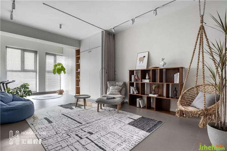 簡易的舒適分離式沙發(fā)+隨手可觸及的開放式書柜+可供孩子玩樂的秋千,大大增加了父母和孩子共處的時間。