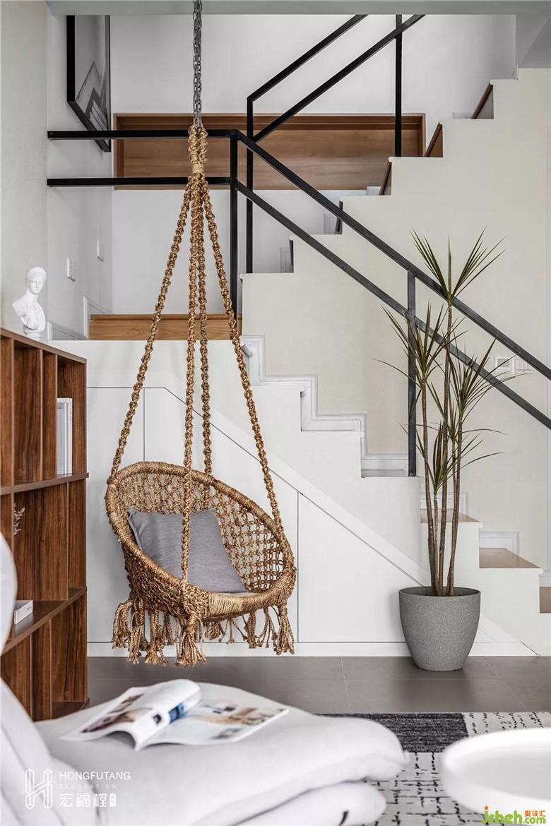 設(shè)計師改變了原始樓梯方向增大客廳空間面積,同時樓梯下部增設(shè)收納處。秋千、綠植為靈動元素,調(diào)和了空間的靜謐。