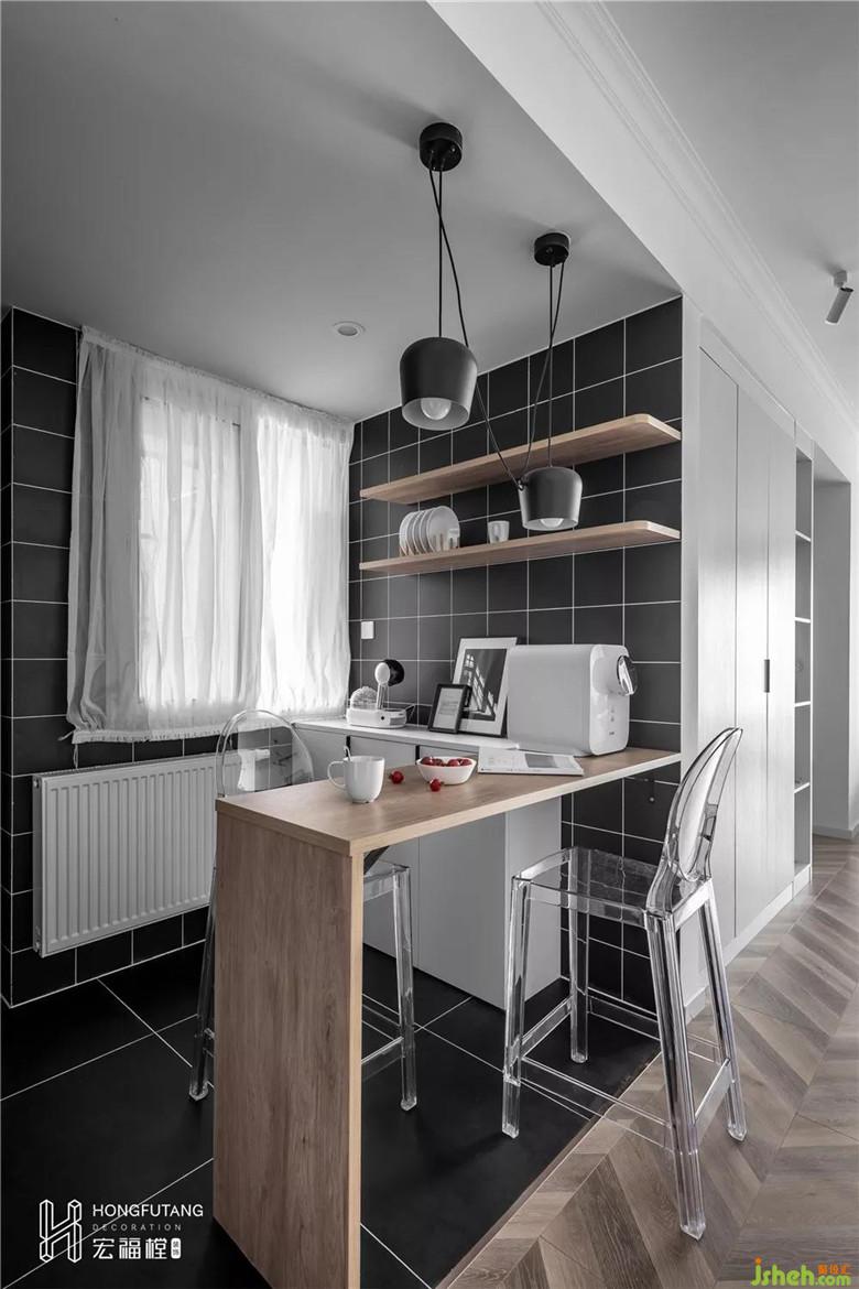 考慮到原廚房空間擁擠封閉,沒有采光和通風(fēng),所以將生活陽臺與之合并,并隔出一個(gè)設(shè)備區(qū)放置天然氣表與熱水器。