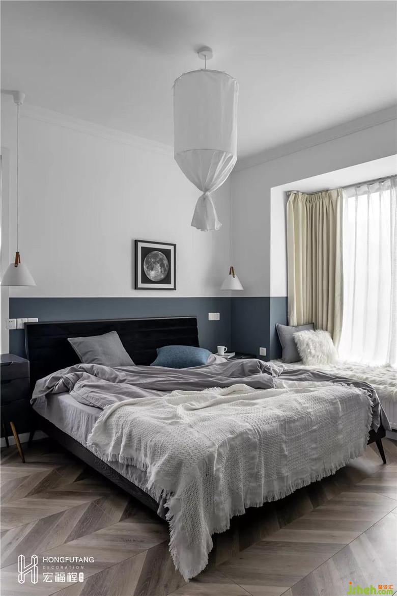 主臥以融入的藍(lán)色調(diào)來純粹靜謐的睡眠氣氛,棉麻質(zhì)地的生活用品與木質(zhì)床頭柜的融合巧妙的讓空間回歸自然本身。