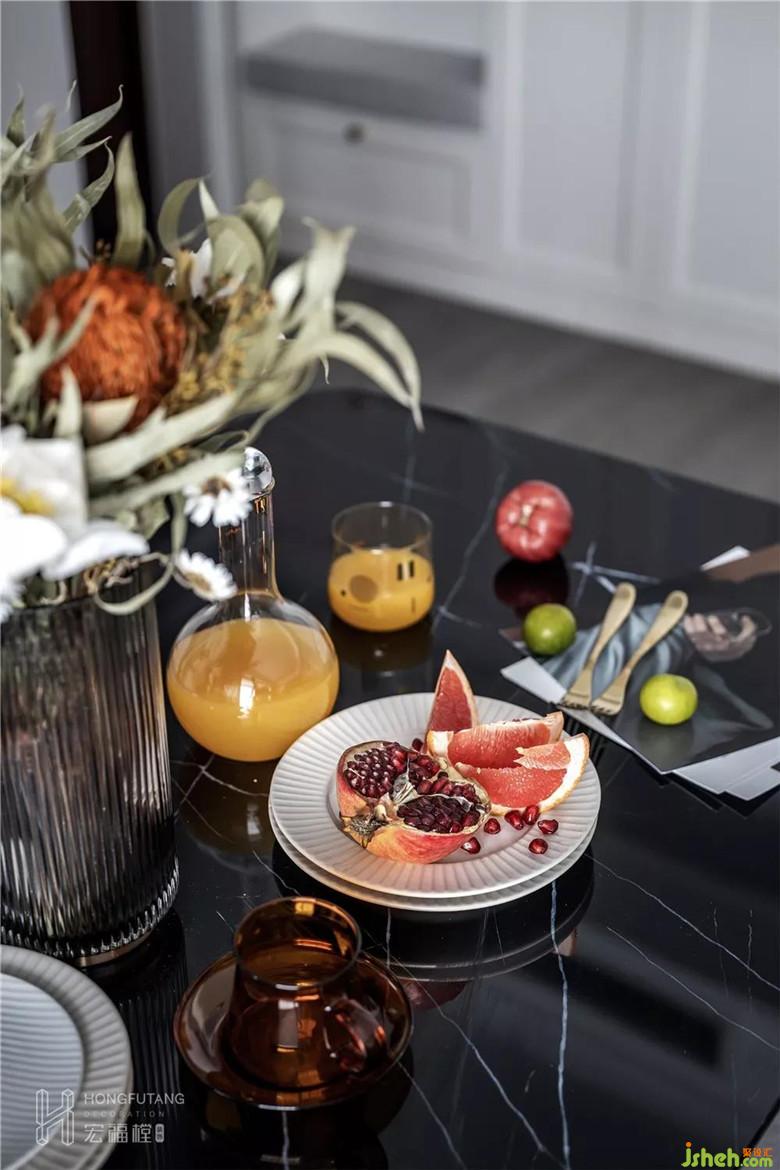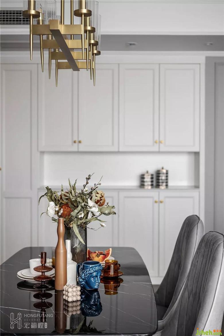 餐桌右邊一整排嵌入式收納柜與墻面合二為一,美觀與實(shí)用兼得。用低純度顏色的玻璃瓶和干花用以餐桌裝飾,摒棄了更換鮮花的繁瑣,香味也日久彌新。