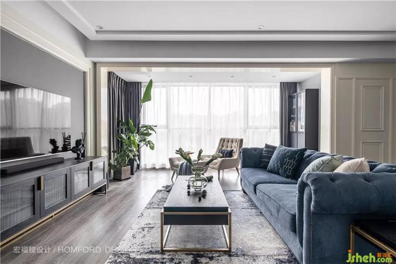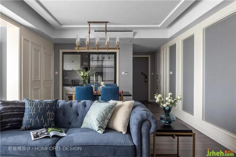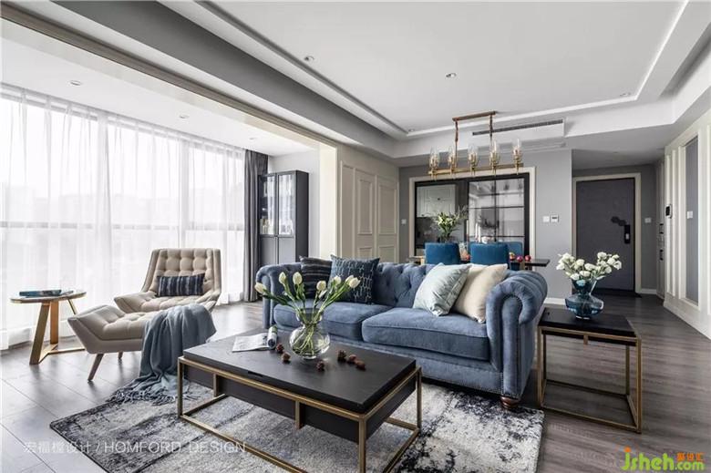 空間色調(diào)簡(jiǎn)約、硬朗。乳白和灰色營(yíng)造柔和舒適的氛圍,藍(lán)色帶來(lái)神秘、深邃和含蓄的空間感受。
