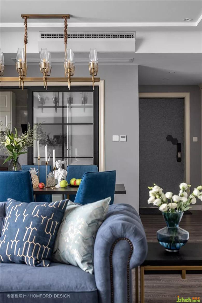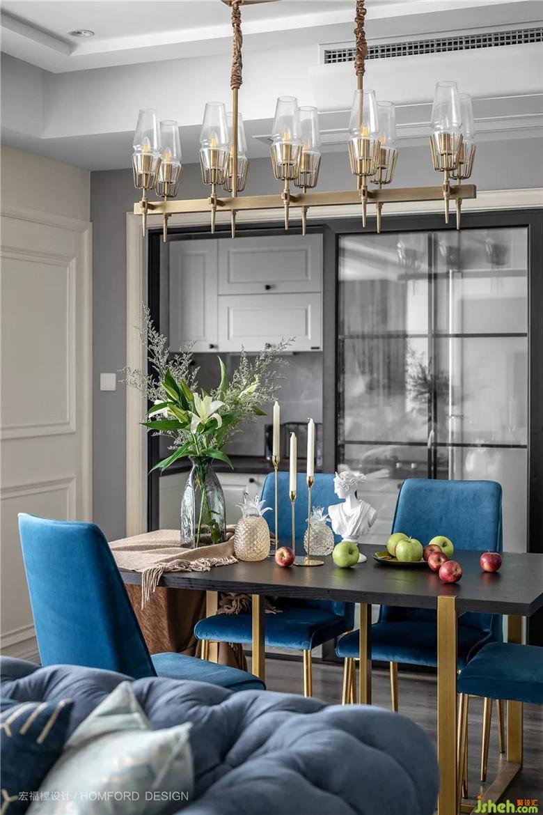 藍(lán)色麂皮金屬座椅呈現(xiàn)出后現(xiàn)代視覺(jué)與觸覺(jué)的完美結(jié)合,在色彩上為就餐氣氛帶來(lái)趣味和動(dòng)感。