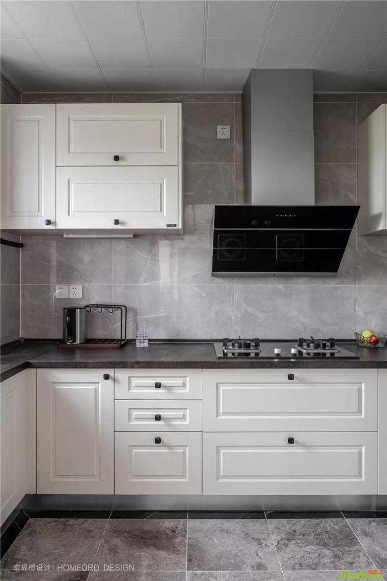 廚房與餐廳由一扇玻璃門隔開,白色櫥柜搭配灰色大理石磁磚讓空間在視覺上簡潔明亮。