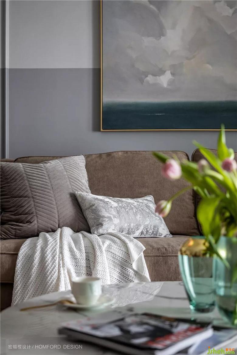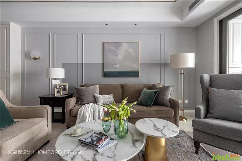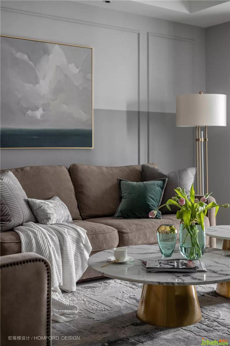 空間以無彩灰色為主,簡單的吊頂點(diǎn)綴,輕便明朗的沙發(fā)和大理石金屬質(zhì)感茶幾,讓整體視覺清爽明快。