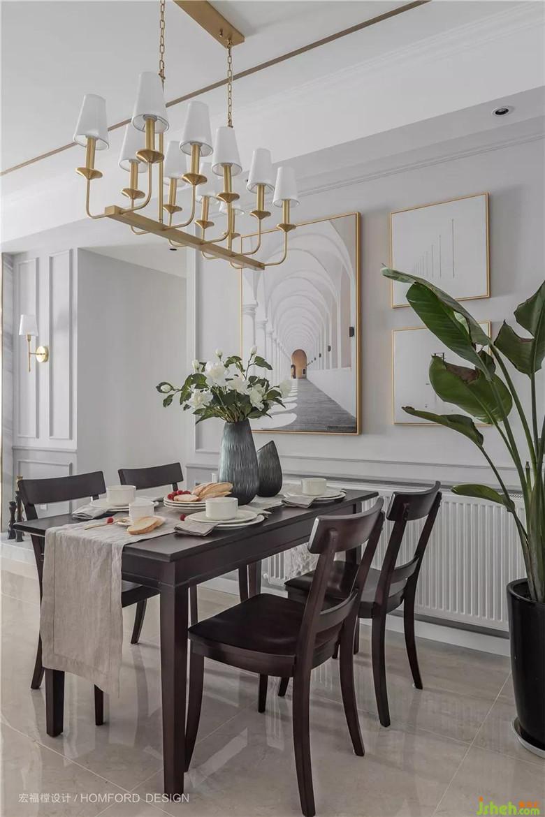 黑胡桃木色餐桌簡潔大方,金屬吊燈則帶有一些美式古典情懷。