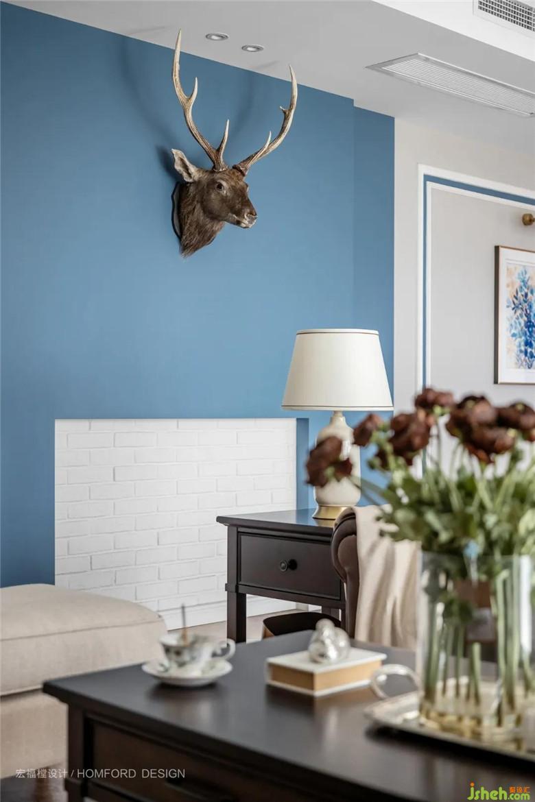 沙發(fā)通過(guò)同色系深淺不一的色調(diào)處理,鋼藍(lán)色為后退色、給人以空間整體向后延伸感,疊加文化石肌理,賦予空間一種動(dòng)態(tài)韻律和美感。