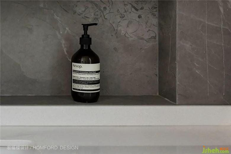 洗手臺(tái)細(xì)節(jié)處,我們利用墻體空間錯(cuò)位設(shè)計(jì)出壁龕儲(chǔ)物,這樣直觀的設(shè)計(jì)簡(jiǎn)化了拿取步驟,表達(dá)屋主一家“斷舍離”的生活狀態(tài)。
