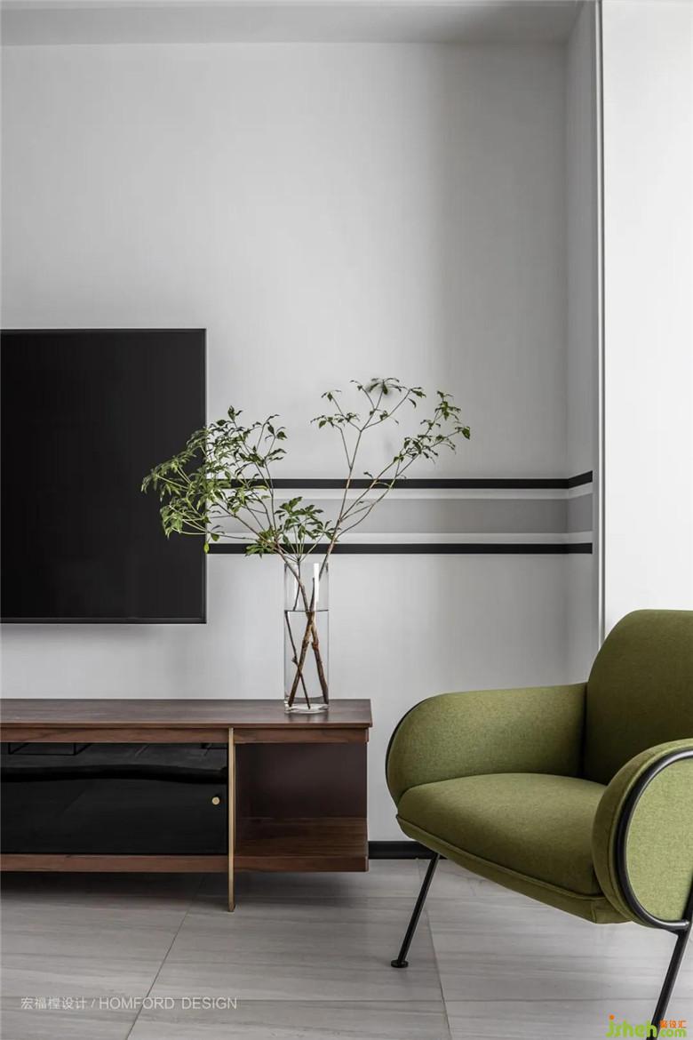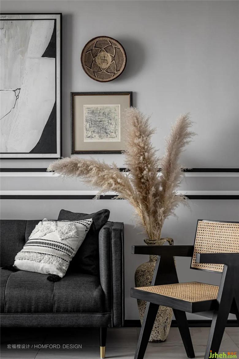 墻面以白、灰為主,紋理自然的灰色瓷磚貫穿整個(gè)空間。純手工拼色腰線以入戶為起點(diǎn),通過(guò)直線牽引出空間動(dòng)線,使空間呈現(xiàn)出層次豐富的動(dòng)態(tài)變化。時(shí)髦的現(xiàn)代氣息中加入沉穩(wěn)的黑白與自然氣韻,營(yíng)造出脫離現(xiàn)實(shí)感的藝術(shù)氛圍。