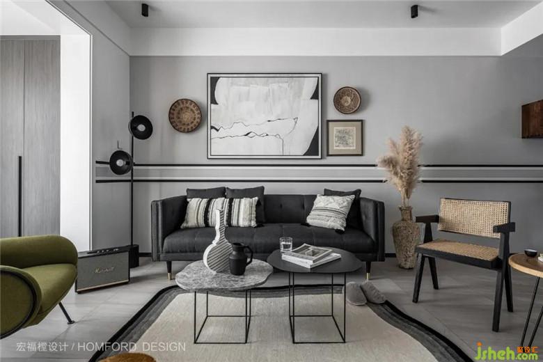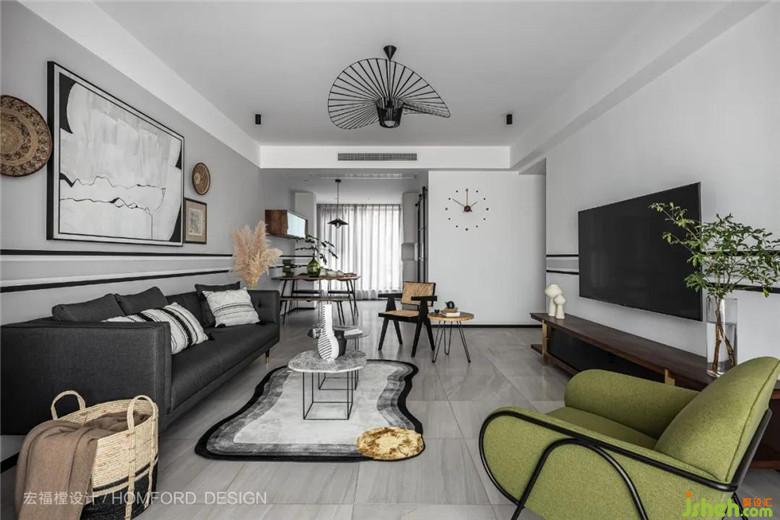 整體線條簡(jiǎn)單、用極簡(jiǎn)低飽和度色塊進(jìn)行區(qū)分。空間多處大面積留白、黑灰原木用以點(diǎn)綴,大量采用自然元素中的綠植、青苔、藤編材質(zhì)裝點(diǎn),使空間氛圍貼近自然的同時(shí)仍保留理性空間審美。