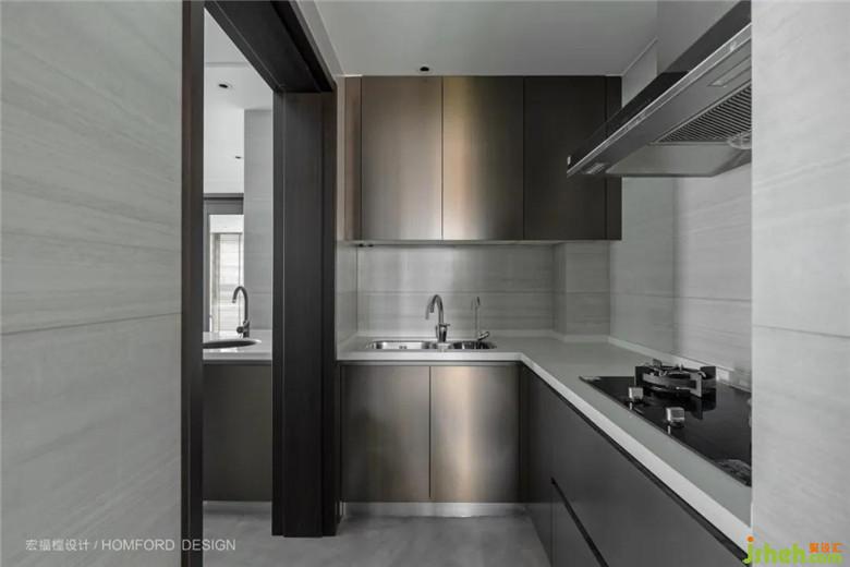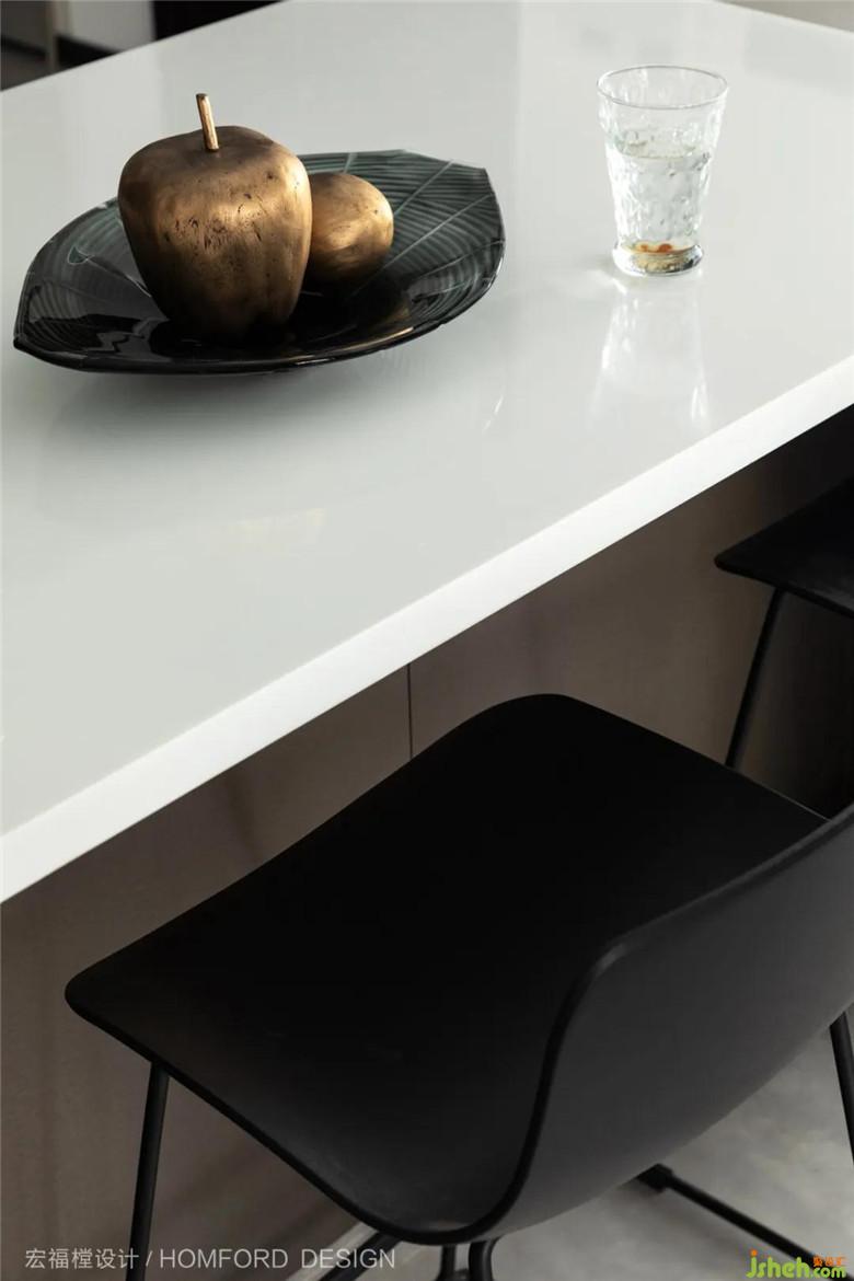 延續(xù)了西廚的配色,不銹鋼拉絲櫥柜和淺灰大理石瓷磚讓光影更加充足,隱約可以感受到一天之中的時(shí)間變化。