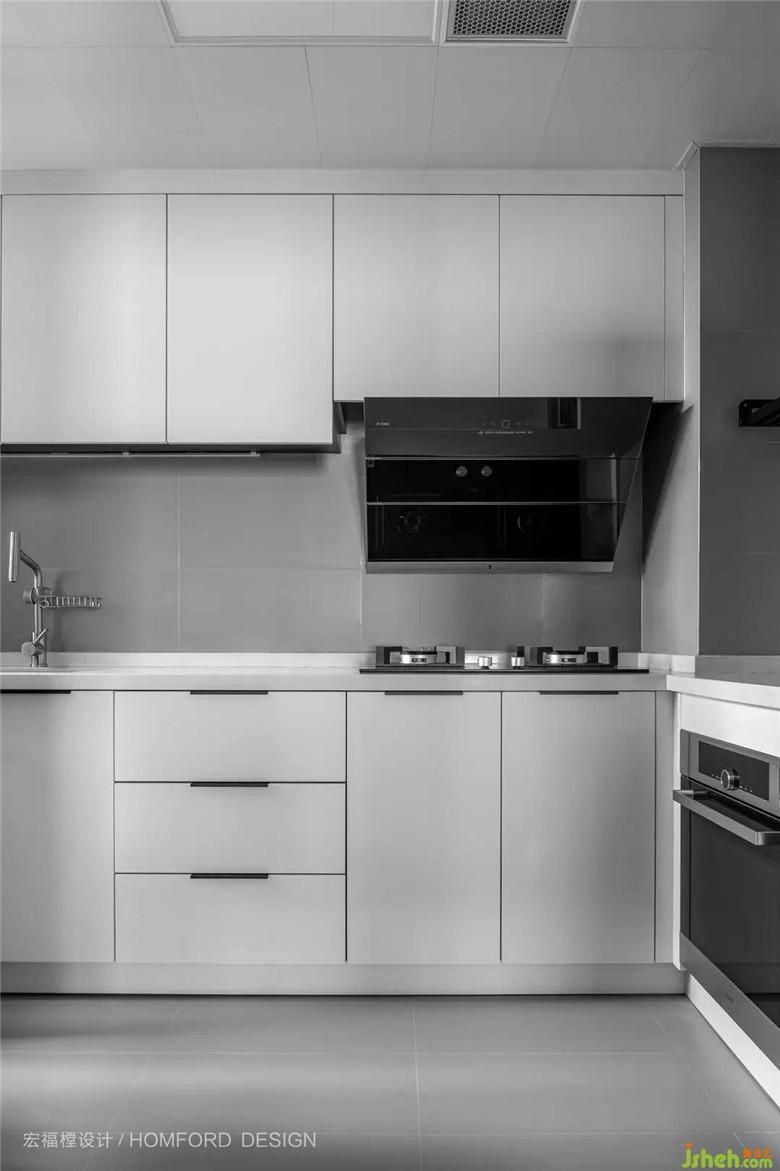 極窄黑框推拉玻璃門后是人間煙火氣,廚房整體黑白分明,寬敞明亮。借用小小2.5㎡陽臺空間,讓使用舒適度翻番。
