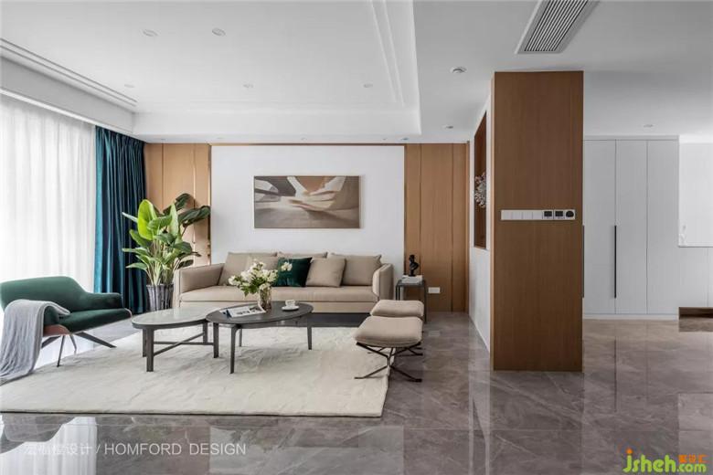 客廳采用無主燈設(shè)計(jì),動線流暢,大方簡潔而又不失現(xiàn)代時(shí)尚感。沙發(fā)墻與沙發(fā)色系統(tǒng)一,在視覺上營造出充滿藝術(shù)張力的美術(shù)效果。
