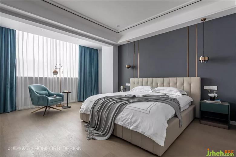 主臥面積寬敞,一整面窗戶帶來了極好的采光。整個空間色彩簡約淡雅,穿插一些金屬元素避免了乏味。水藍色的窗簾與沙發(fā)讓空間更放松,增添了臥室中的舒適與愜意感。