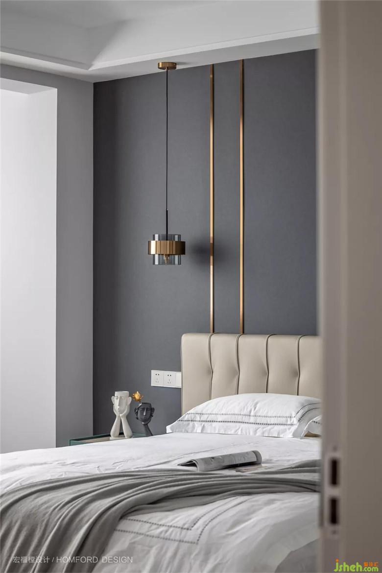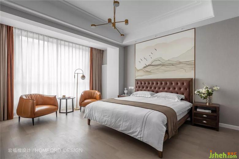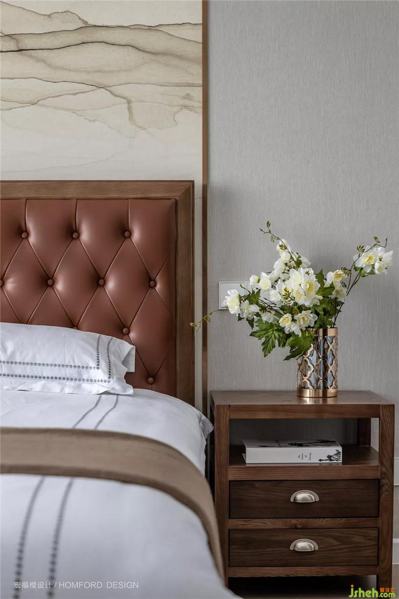 次臥雖為老人居住,但在風格上不希望做的太傳統(tǒng)。于是選擇皮質軟包床而又在墻上融入了一副中式畫,傳統(tǒng)又不失現(xiàn)代感。