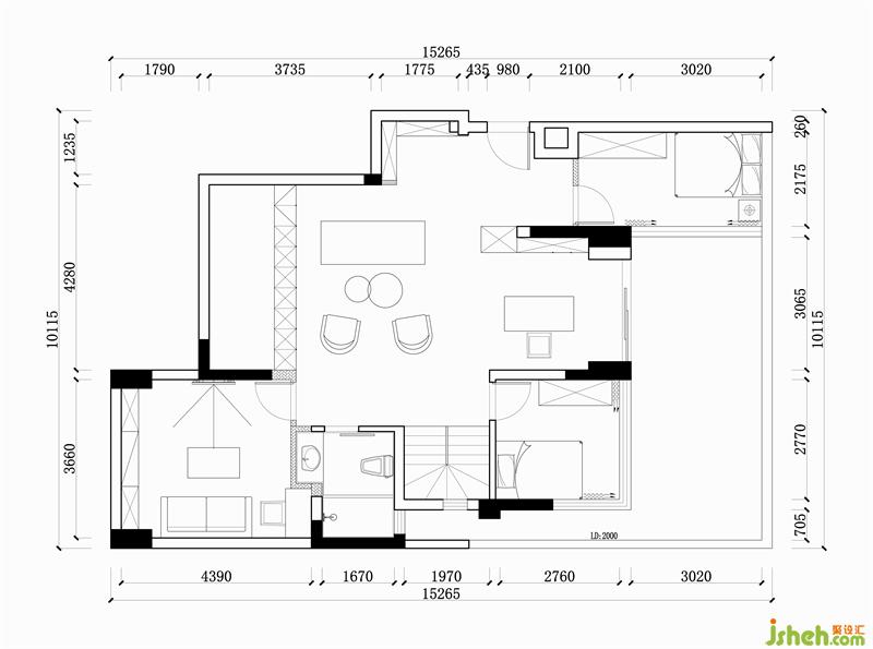 原玄關右側為樓梯,從使用舒適度和美觀性上都顯雞肋。于是我們將正對玄關側方的次衛(wèi)改成了樓梯間入口。無論從訪客還是居住者本人的空間活動路徑來講都更加合理,客餐廳廚房為公區(qū),以樓梯為界,兩側臥房為私區(qū),公私分區(qū)動靜明確。