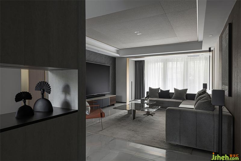 我們調整樓梯布局后客廳空間得以釋放,增加電視墻橫向尺寸,完美解決了原結構兩面背景墻的比例分割不合理問題。確保比例協調再利用長虹玻璃獨有的透光性,營造出若影若現的穿透效果。
