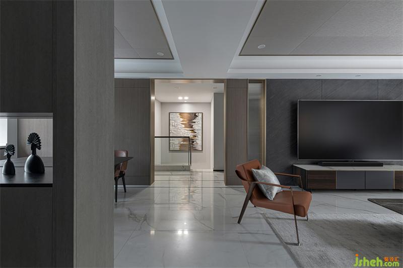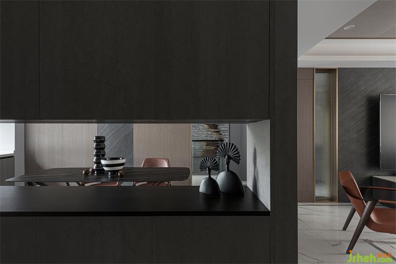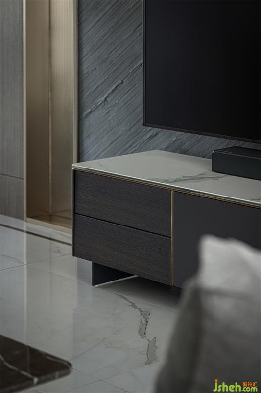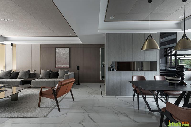 飾面材質貫穿整個客餐廳空間,各區(qū)域相互呼應同時保有相對獨立性,石材、金屬材質的穿插,讓原本乏味的空間更具律動感與趣味性。