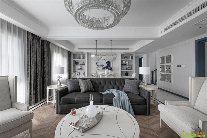 客廳整體以灰色與米色為基調亮柔、優(yōu)雅,深灰藍用以點綴,沉靜有力。地面采用暖木色仿魚骨拼木紋磚跳色做冷暖調和,清爽自然營造出居住的溫馨場景。