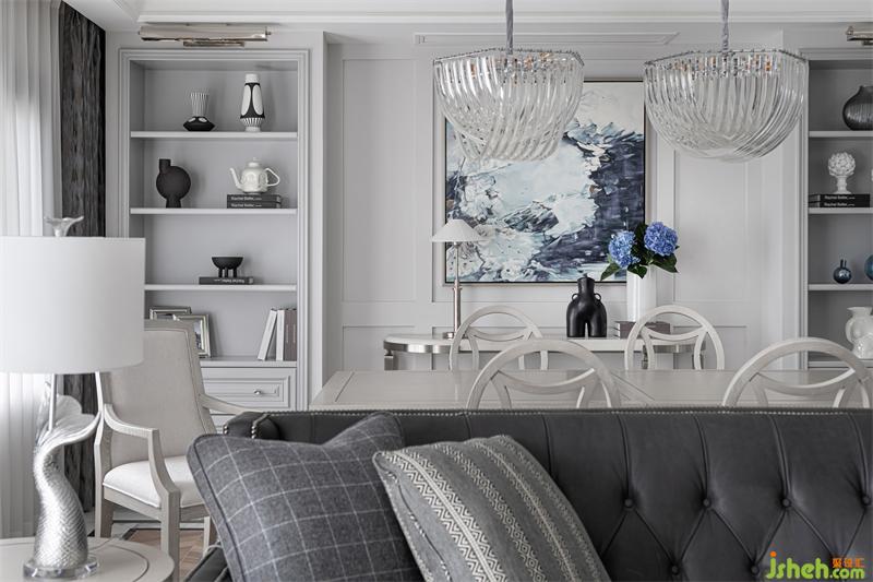 客房納入客廳后由原豎廳變?yōu)闄M廳,兩面落地窗使得采光翻倍空間更具通透性。客餐廳利用頂部及家具進行三段式布局,2/3的大面積空間留給客廳,1/3沙發(fā)后的餐廳區(qū),餐廳背景墻對稱嵌入式高柜用以裝飾點綴同時兼具一定收納功能。