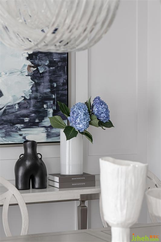 對稱感在餐廳的硬裝部分得到淋漓盡致的展示,旅行中的戰(zhàn)利品通過非對稱的方式進行陳列,讓空間平添一份活潑、靈動。藍色繡球與主掛畫相得益彰,女屋主對花材的喜愛在這里得以體現,環(huán)境所創(chuàng)造的場景與他們的生活習慣密切相連。