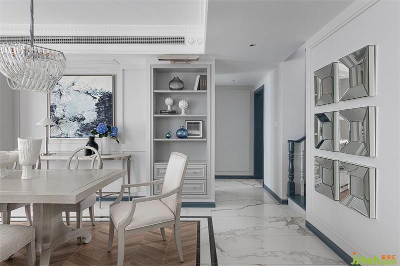 我們通過近半個月的家訪了解屋主之前的生活方式、興趣愛好,圍繞著他們獨有的一半旅行一半居家的狀態(tài)延展,提煉出關鍵詞“開放性”“儀式感”。僅兩人使用的空間實在不必碎片化分區(qū),于是我們將空間全部“打開”讓偶爾接待訪客一起使用的公區(qū)通透寬闊更具互動性,同時客房預留在一樓以備不時之需,而不想被打擾的私密空間設定在二樓更具隱私性。整屋穿插使用實木、大理石材、金屬、玻璃,融合低調內斂的藍、白、灰作為空間主色調寧靜、雅致,營造高級雅致的空間氛圍。