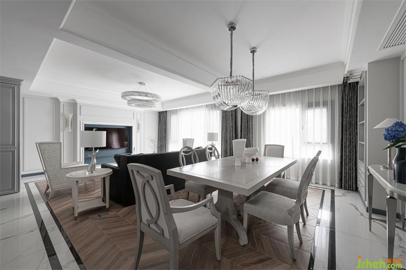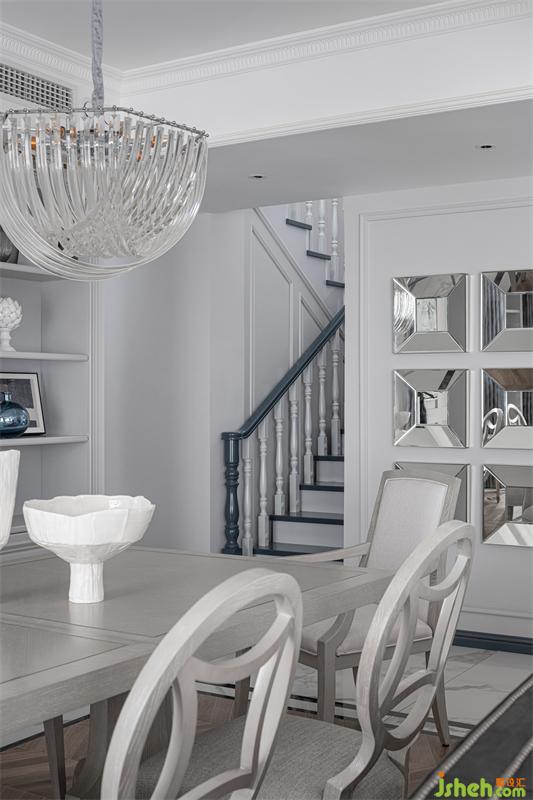 在樓梯側(cè)面,我們?cè)O(shè)置了一整排儲(chǔ)物間用來(lái)堆放清潔用品、行李箱等,因其沿用與走廊樓梯一致的裝飾線條藏而不露。模擬天井的邊頂造型貫穿全屋從一樓至二樓延伸,銀質(zhì)復(fù)古蠟燭吊燈優(yōu)雅大氣成為點(diǎn)睛之筆。