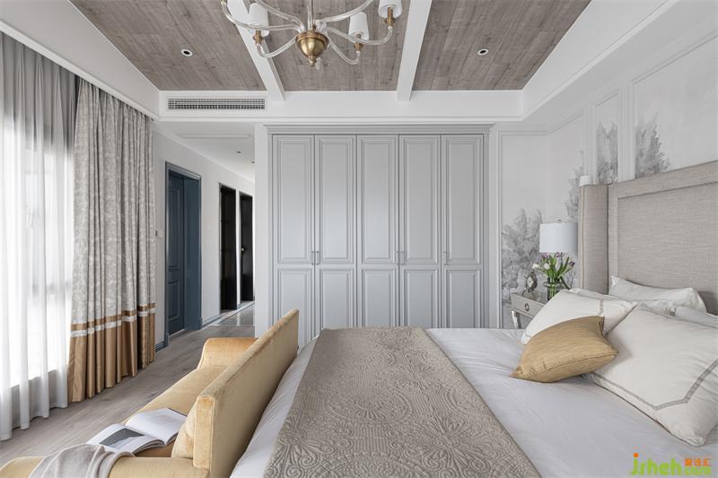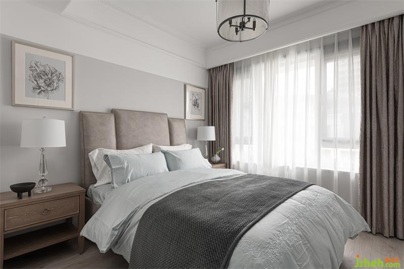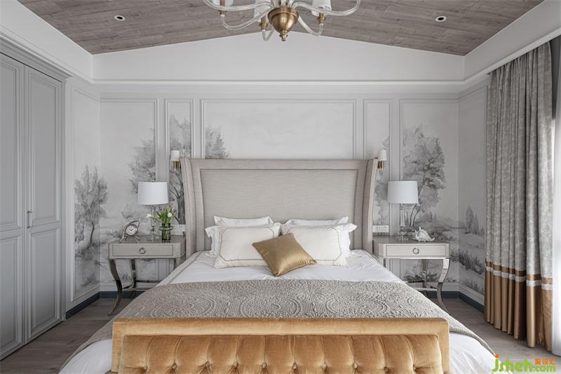 低調(diào)溫和的冰川灰作為臥室的墻面基調(diào),并進(jìn)行400mm的分色處理,讓空間更具層次感。鉚釘軟包床、藝術(shù)掛畫、玻璃臺(tái)燈、木質(zhì)床頭柜,形成現(xiàn)代與美式古典家居相融的舒適氛圍。
